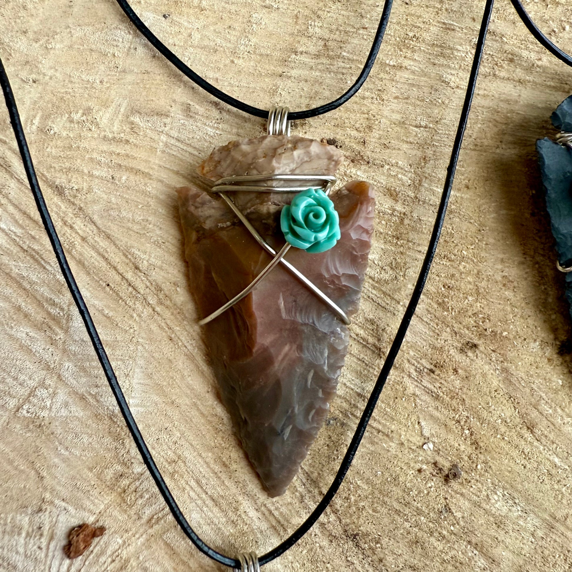 Handmade wire-wrapped arrowhead pendant featuring a silver wire wrap and turquoise rose accent. Hung on an adjustable black leather cord, this unique piece blends rustic charm with artisan detail—perfect for everyday wear or gifting.